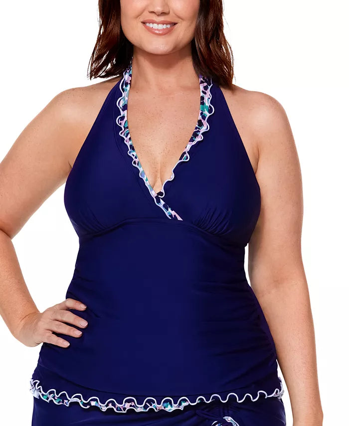Ruffled contrast trim draws the eye in this chic plus size tankini top from Island Escape.
