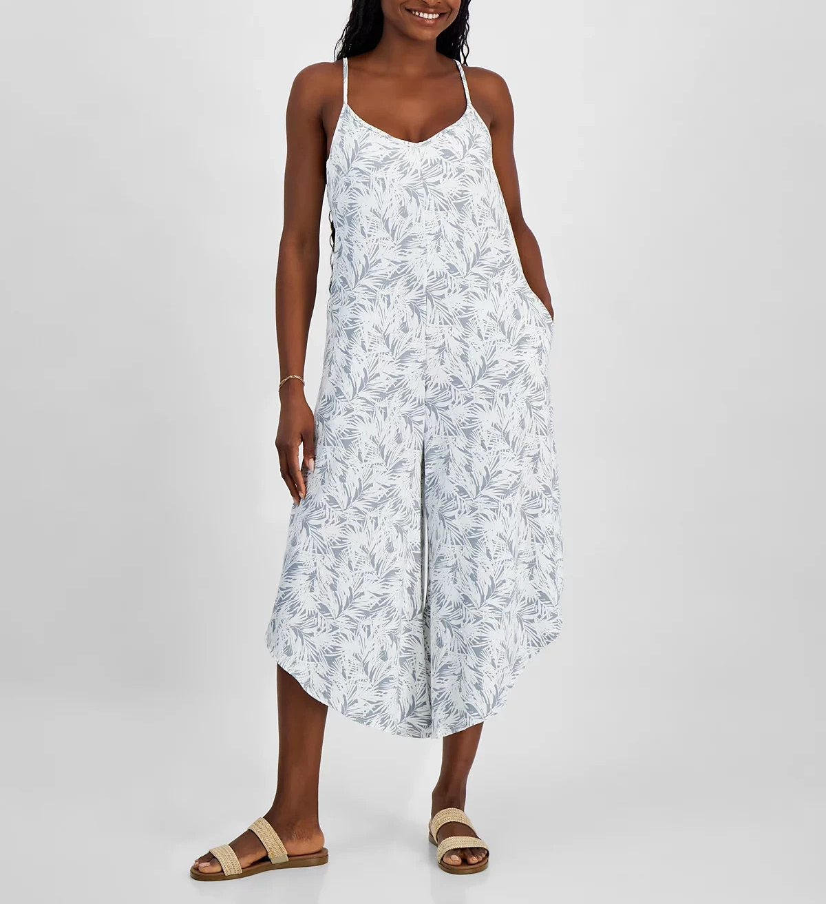 Scoop neckline Sleeveless Adjustable straps Pulls on Side-seam pockets; asymmetric hem Inseam: 20.5 in Polyester/spandex Hand wash Imported