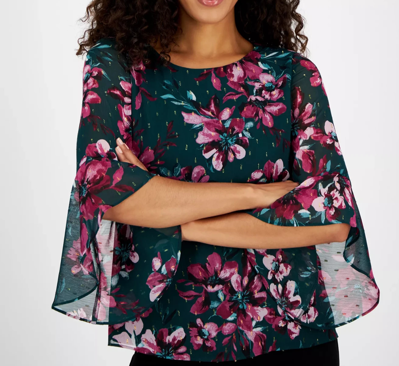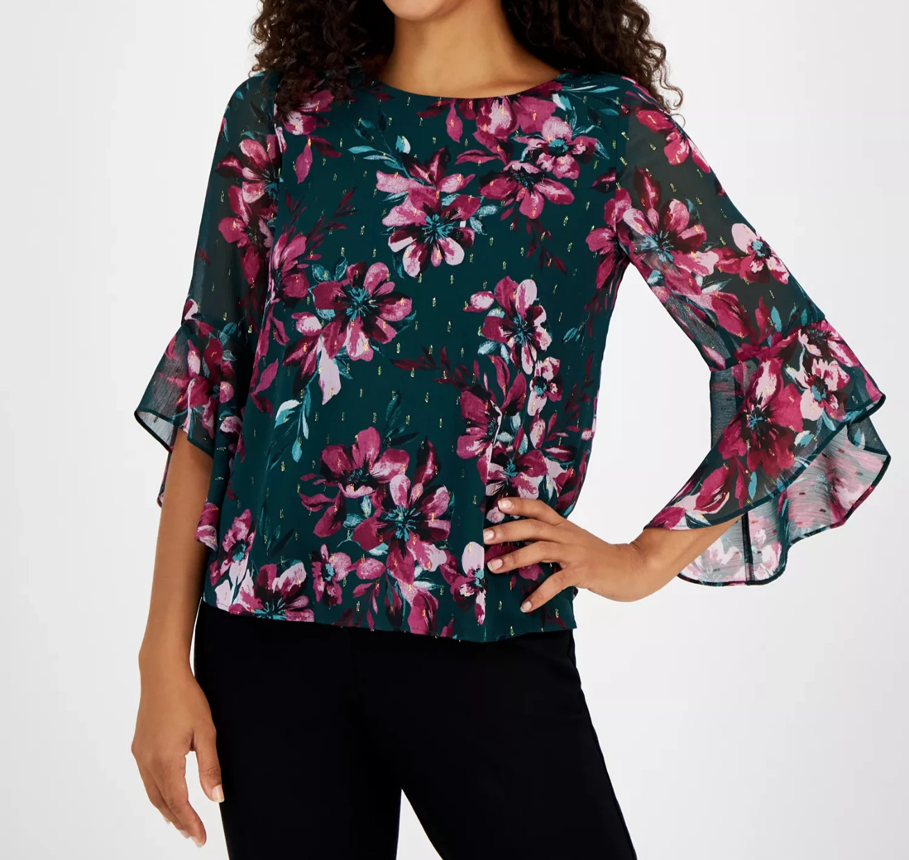 Kasper Petite Floral-Print Ruffled-Sleeve Blouse MSRP $69