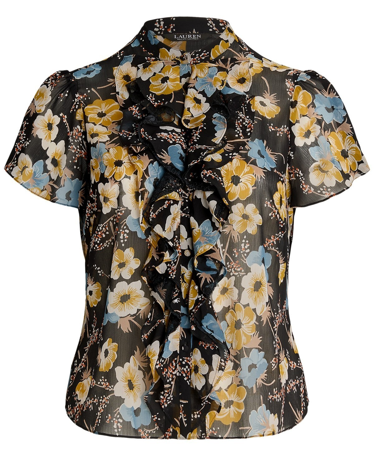 With cascading ruffles, flutter sleeves and the season's enchanting floral motif, this Lauren Ralph Lauren blouse effortlessly captures the spirit of romance. Detailed with lace trim at the ruffles, this style is crafted from airy crinkle georgette for an effortless drape.