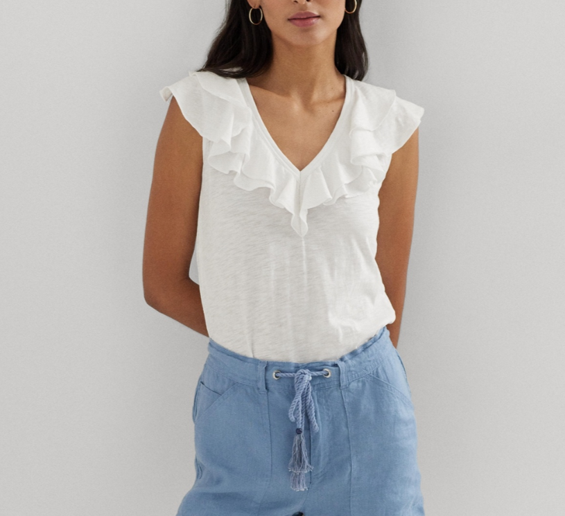 Made with lightweight slub jersey for an unbelievably soft hand, this sleeveless tee from Lauren Ralph Lauren is elevated by a playful, ruffle-trimmed V-neck. An "LRL"-embroidered logo at the hem adds a signature finishing touch.