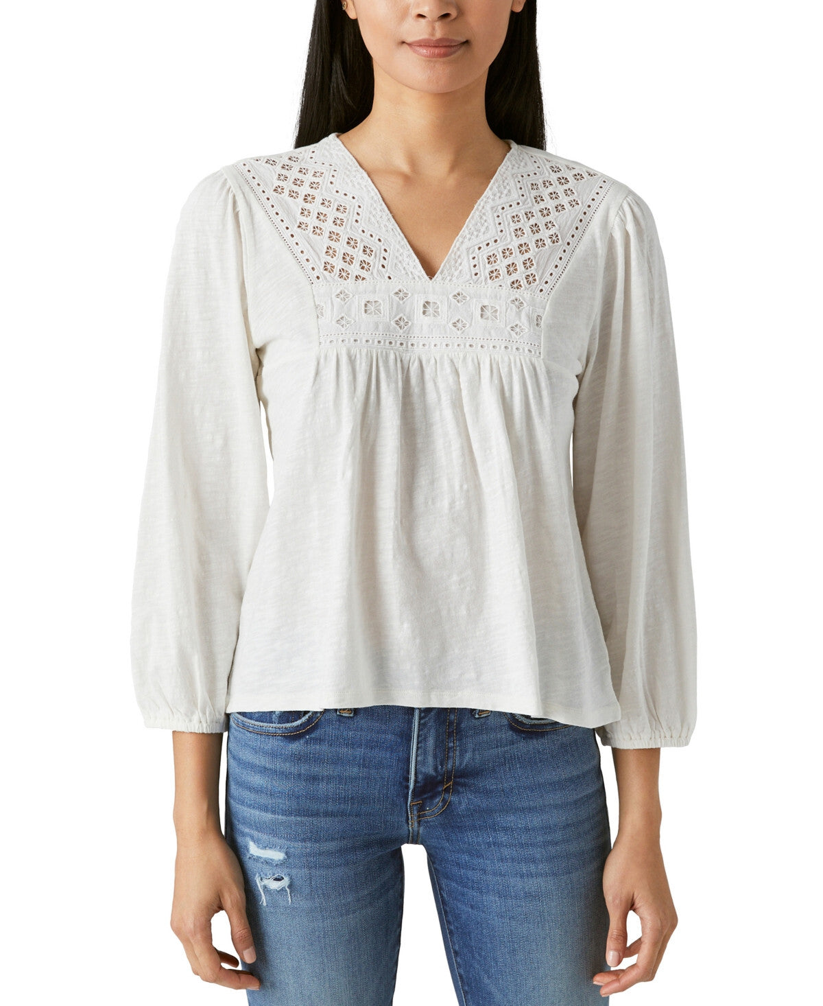 Beautiful embroidery and breezy cutouts top off the roomy textured cotton shape of this pretty peasant-inspired style from Lucky Brand.