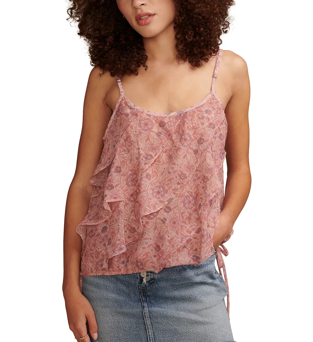 Let loose and have fun in this women's camisole top from Lucky Brand. From Lucky's limited edition Festival Finds capsule collection, this sleeveless cami shows off fun ruffle detail across the bodice in an asymmetrical pattern and all-over pretty print that matches with anything in your closet. Pair with your favorite denim shorts for the perfect festival fit.