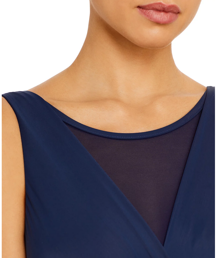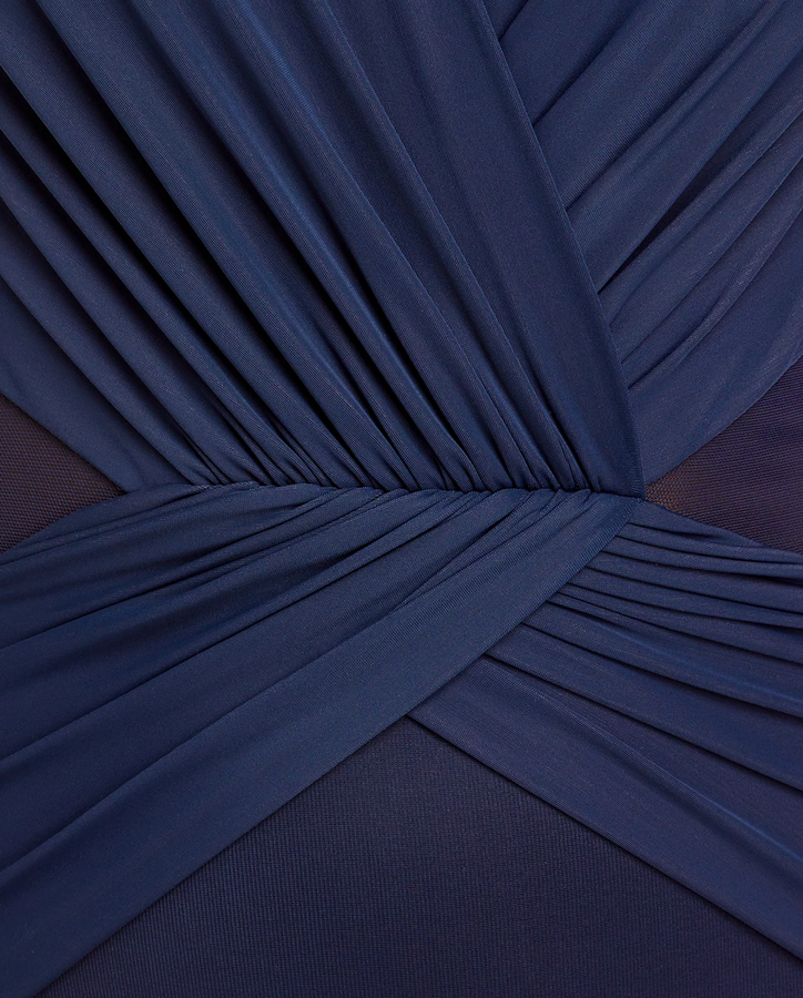 Crossover V-neck with draped crisscross bodice for a waist-cinching effect