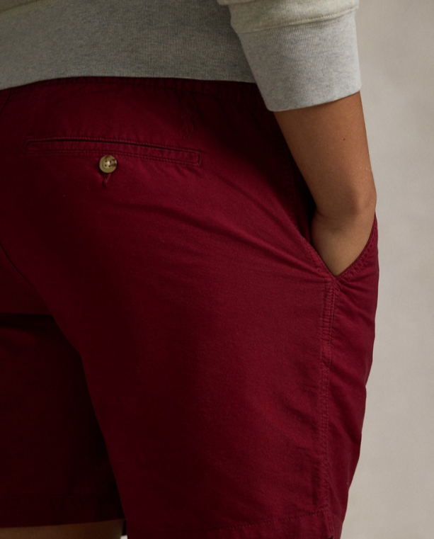 Inseam: 7" Stretch Classic-Fit: sits at the waist Eased through the leg Elastic waistband with an interior drawstring Zip fly with a buttoned closure Two front angled pockets Two back buttoned pockets Cotton Machine washable Imported