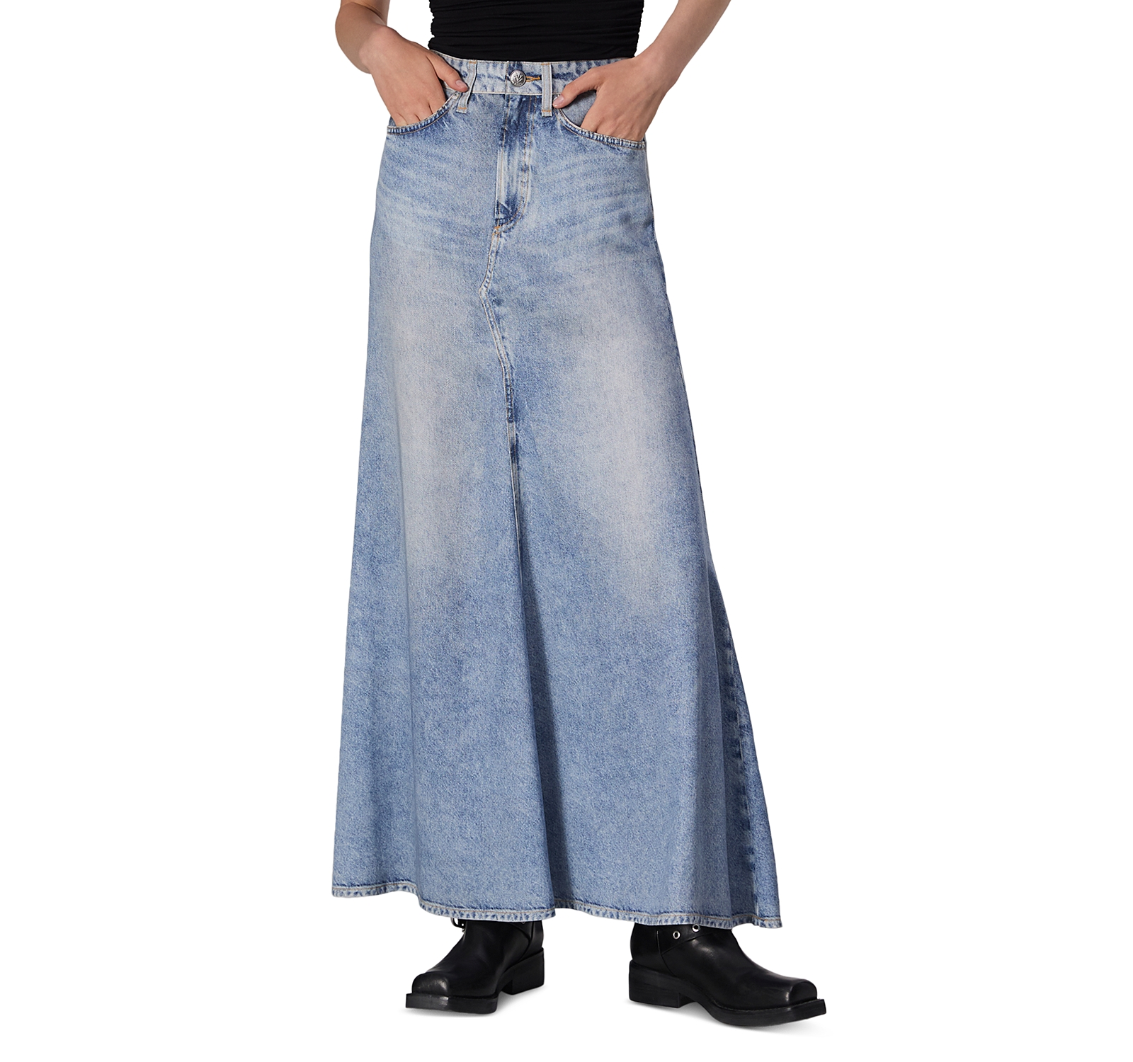 The rag & bone liquid miramar denim maxi skirt is a full length piece. The skirt is denim and features a button detailed fly front.
