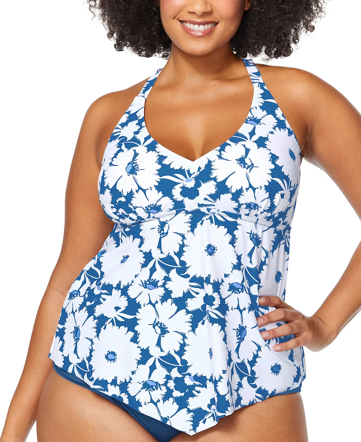 A flowy fit comes alive with a gorgeous print on this plus size tankini top from Raisins Curve. A T-back completes the look.