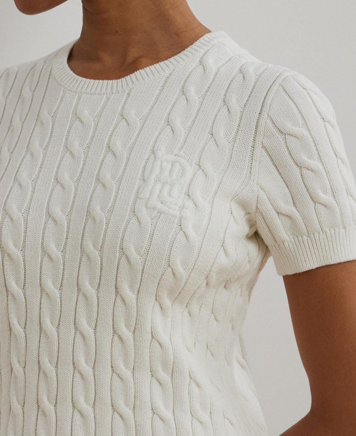 A classic cable-knit construction brings texture and dimension to this short-sleeve Lauren Ralph Lauren sweater, which is realized in unbelievably soft combed cotton. A tonal "LRL"-embroidered logo at the chest provides a subtle signature finish. The perfect gift for your next occasion.