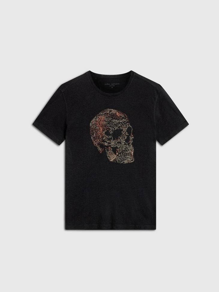 A statement tee for weekend looks, this piece is crafted from a soft linen and modal blend, balancing comfort with character. It features an intricate skull motif, embroidered artfully with a spectrum of multi-colored threads and subtle metallic accents. A soon-to-be favorite in your wardrobe, pair it with our Ethan Wash jeans and low-top sneakers for a relaxed yet refined appearance that transitions effortlessly from day to night.