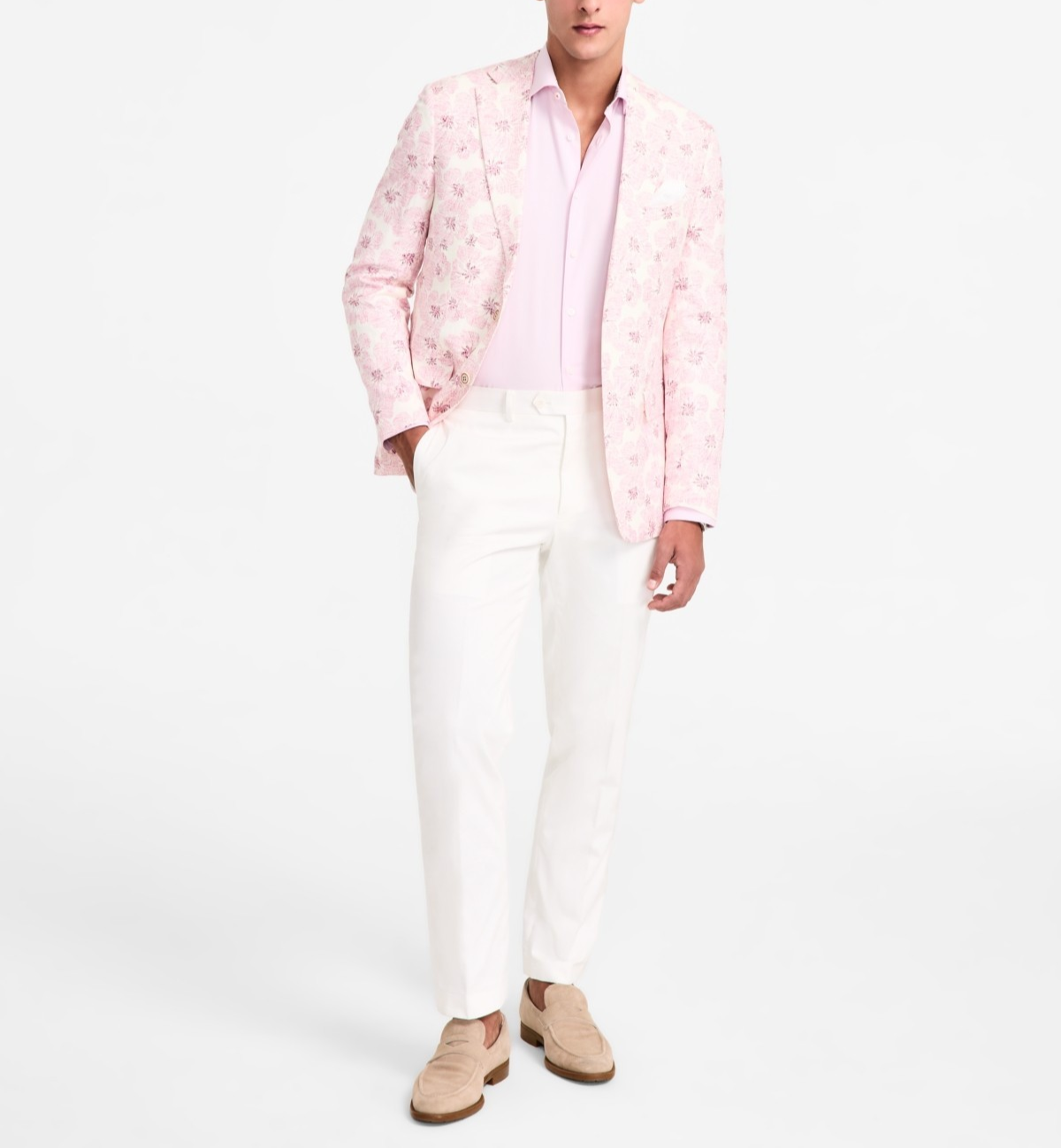 Notch lapel Two-button closure; four-button cuffs Two front flap pockets; left chest welt pocket Side vent Slim fit through the shoulders, chest, and waist with higher armholes and slimmer sleeves Linen/rayon Dry clean Imported