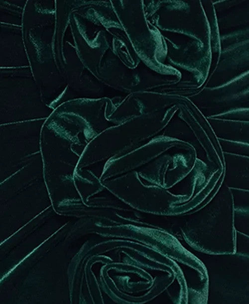 V-neck Long sleeves Rosettes and gathers at waist; slit at center front hem Back zip closure Gown: Floor-length formal dress Velvet: plush, heavy fabric; soft to the touch Polyester/spandex; Combo and lining: Polyester Dry clean Imported