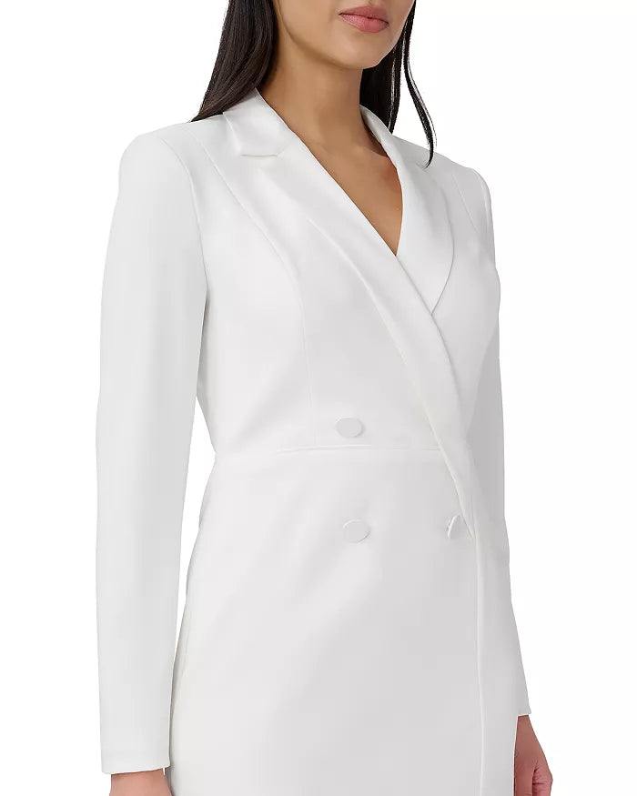 Fitted at the bust, waist and hips Stretchy fabric Designed to hit above the knee Elongated satin notched collar with surplice neck Long sleeves Back zip with hook-and-eye closure Slightly padded shoulders Faux satin covered buttons Sheath silhouette Stretch knit crepe Polyester/elastane; lining: Polyester Dry clean Imported