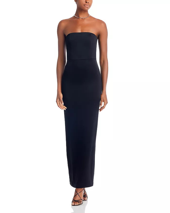 Straight neck Strapless, sleeveless Seamed waist Zipper and hook-and-eye closure at back Back slit Triacetate/polyester; lining: Polyester/elastane Dry clean Imported