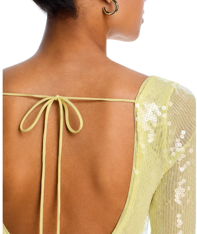 Scoop neck with keyhole tie detail Semi-sheer long sleeves Sequined embellishment at body and sleeves Scoop back with tie detail Snap closure at gusset Partially lined Designed for a fitted silhouette Polyester/elastane; lining: polyester/elastane; contrast: viscose/elastane Hand wash Imported