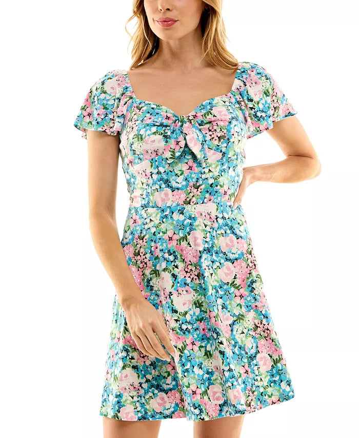 BCX Juniors' Tie-Bow Sweetheart-Neck Floral-Print Fit & Flare Dress