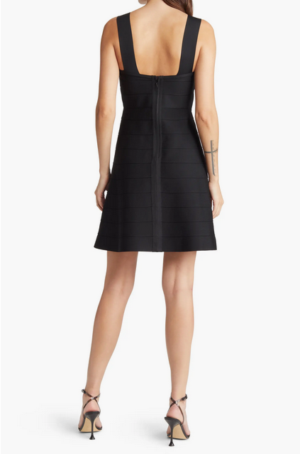 A curve-hugging bandage design flares at the skirt for a fabulous, party-ready look in this V-neck minidress.