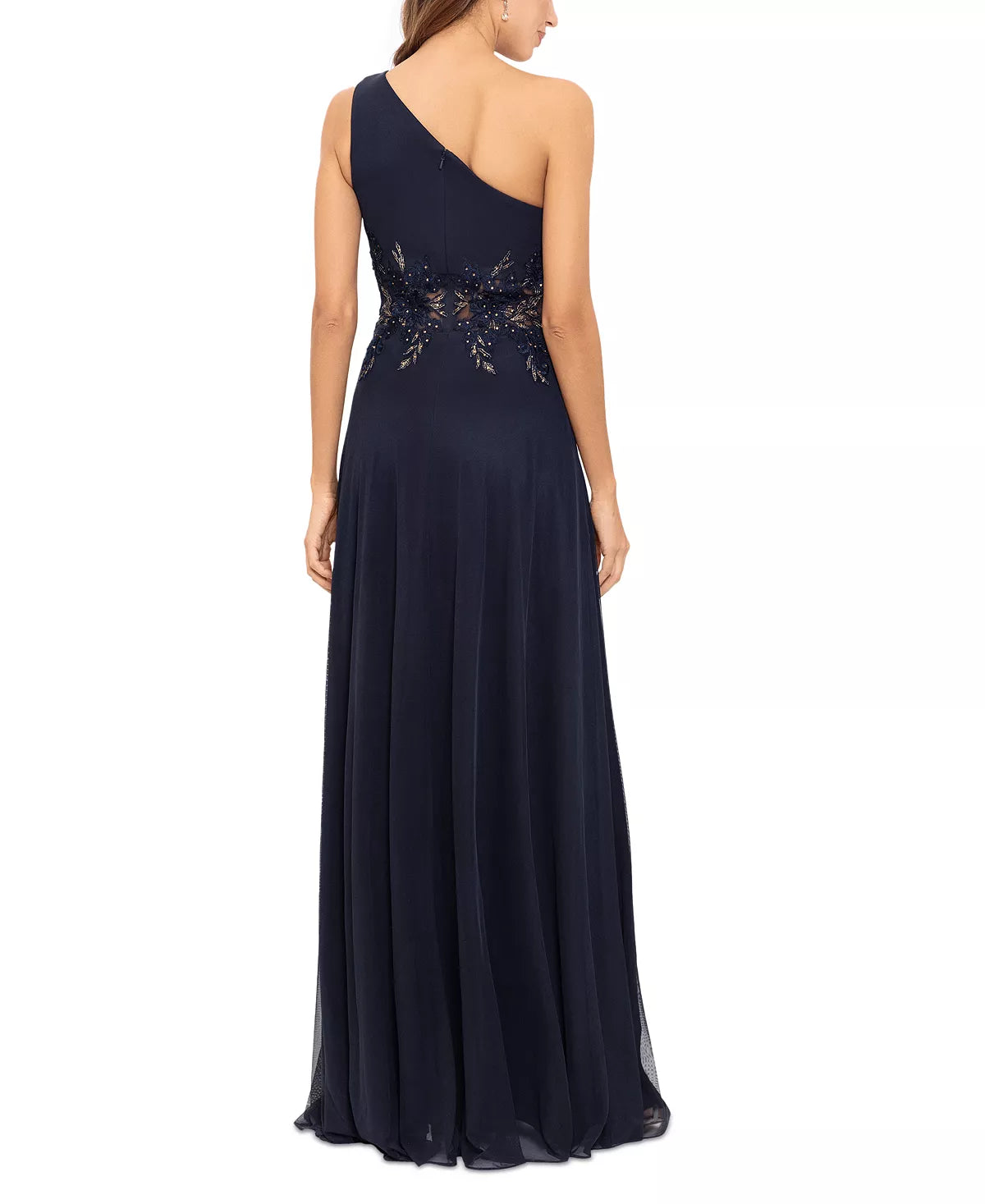 Amp up your glamour in Betsy & Adam's one-shoulder gown, beautifully adorned by floral appliqué.