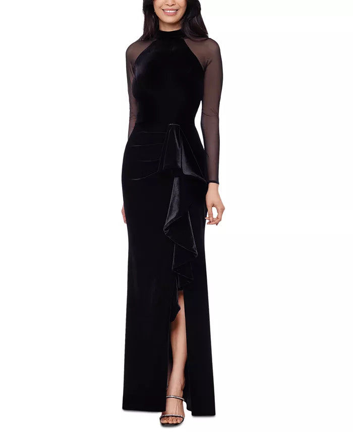 Black-tie perfection. You'll steal the show in this striking gown from Betsy & Adam, a luxe mix of velvet and sultry sheer details.