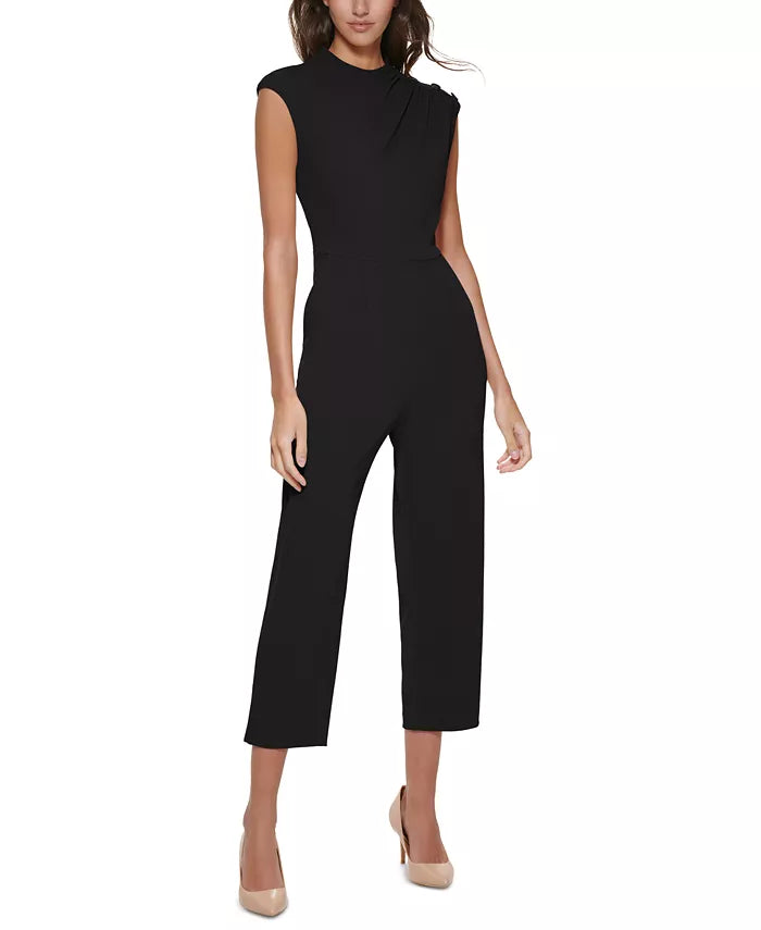 Ultra chic in stretchy and supportive scuba-crepe fabric, this Calvin Klein jumpsuit is sleek enough for formal events. Gathered accents and buttons at the shoulder provide subtle detail for an elevated fee.