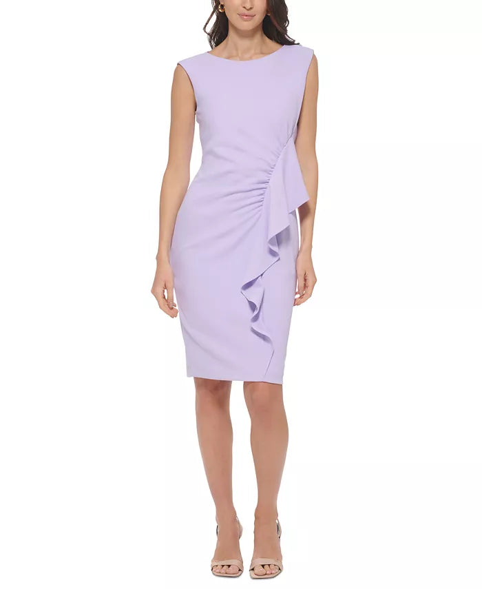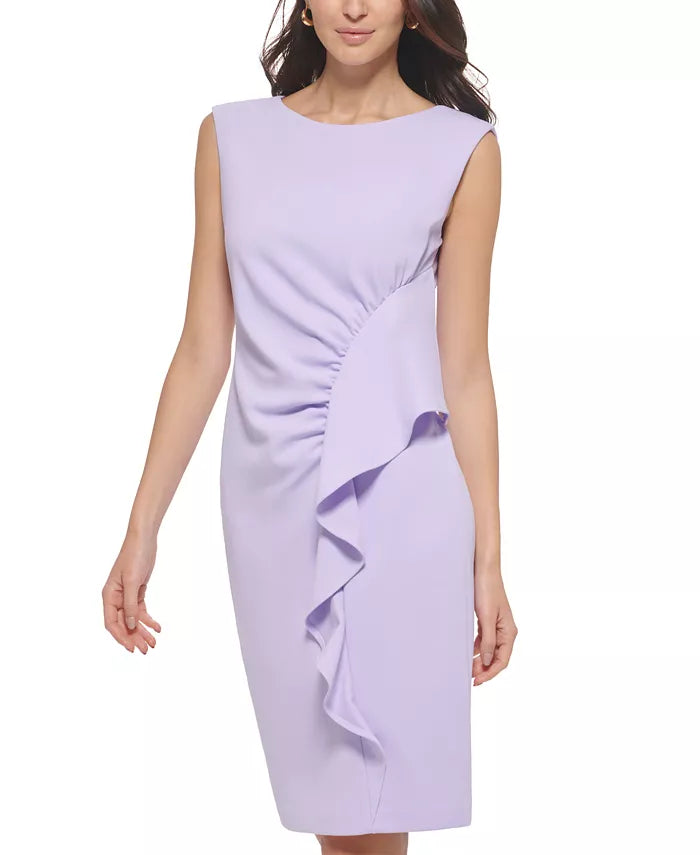 Calvin Klein refines a petite sheath dress, adding gathered details and a cascading ruffle for an elegant take on a classic silhouette.