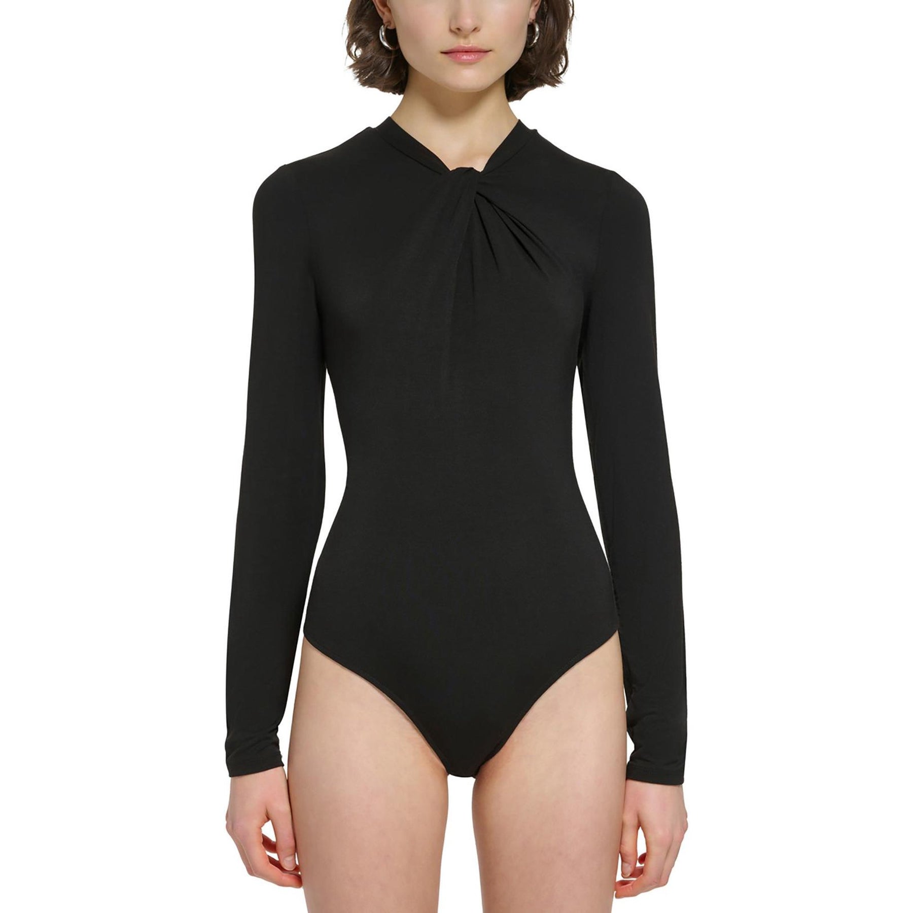 A sleek long-sleeve bodysuit from Calvin Klein offers a unique twist on this staple layering piece. Gathers at the neckline give it a modern look.