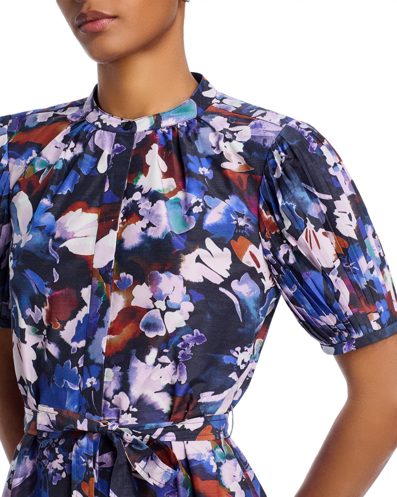 Features Round neck Button front closures, concealed placket Pleated puff short sleeves Concealed side zip closure Tie at waist Pleated tiered skirt Imported