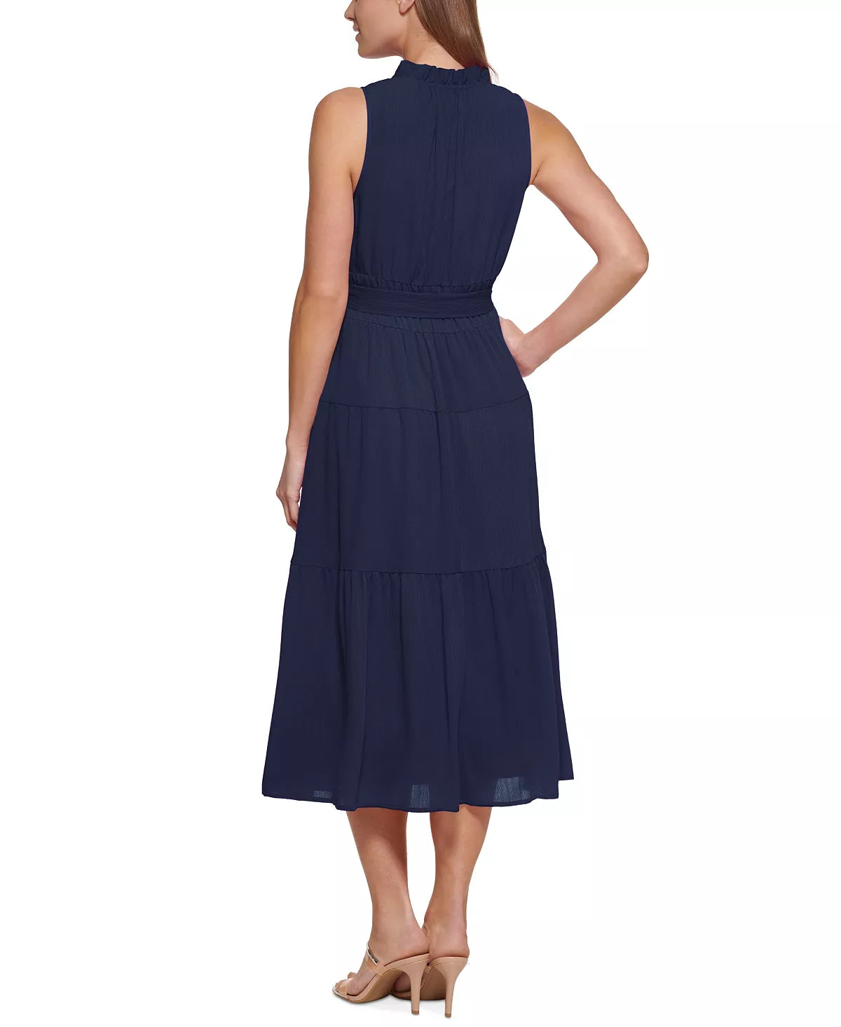 DKNY's season-spanning midi dress features a waist-defining tie and beautifully tiered design throughout the skirt.