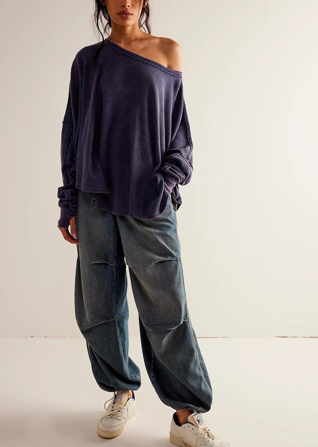 Relaxed, slouchy fit Wide scoop neckline Long sleeves with thumbholes Dropped shoulders Exposed seaming Rounded bottom hem 100% Cotton Machine wash Imported