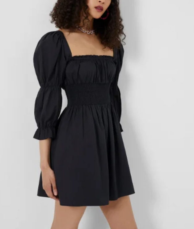 Puffed three-quarter sleeves with elasticized trim and ruffled cuffs