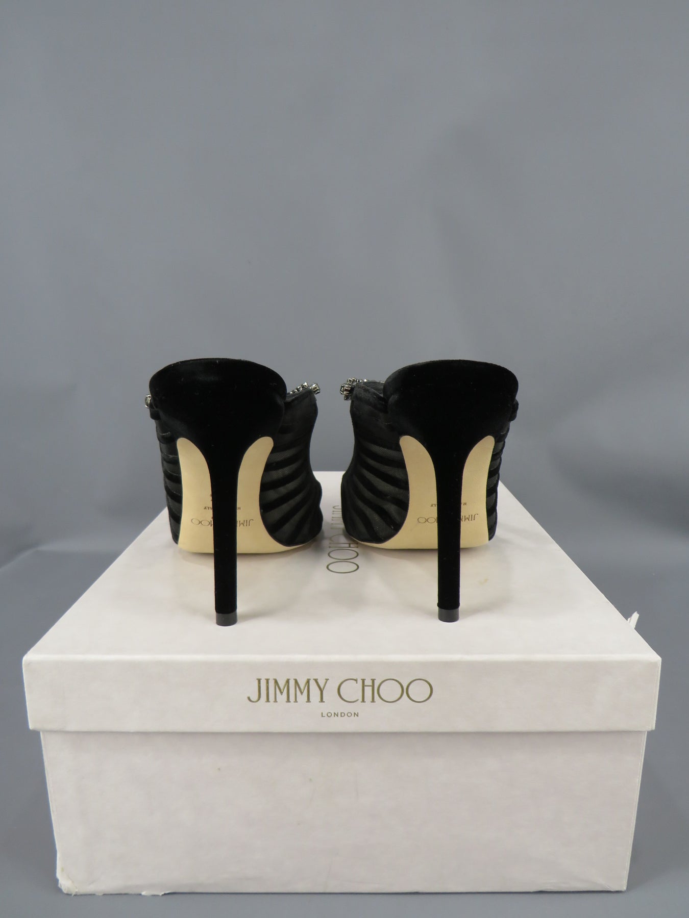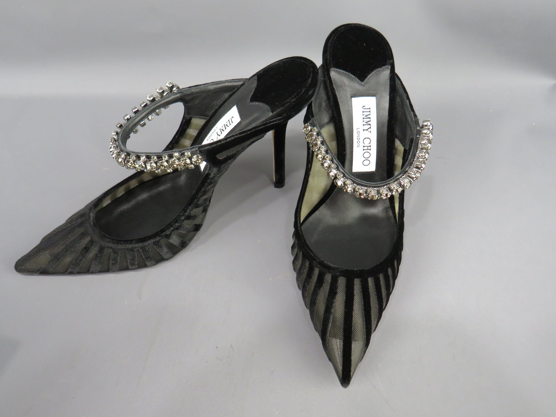 Sparkling crystals dazzle the svelte strap that bridges the vamp of a striking pointy-toe mule in striped-velvet mesh and elevated by a stiletto.
