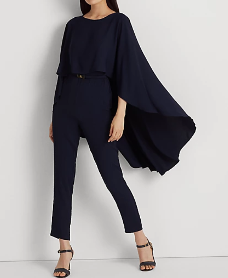 A stylish choice for special occasions, Lauren Ralph Lauren's silky georgette jumpsuit is elevated by a cascading cape, which adds fluid movement to its streamlined silhouette. A self-belt at the waist is accented with an "LRL"-engraved bar buckle for a signature touch.
