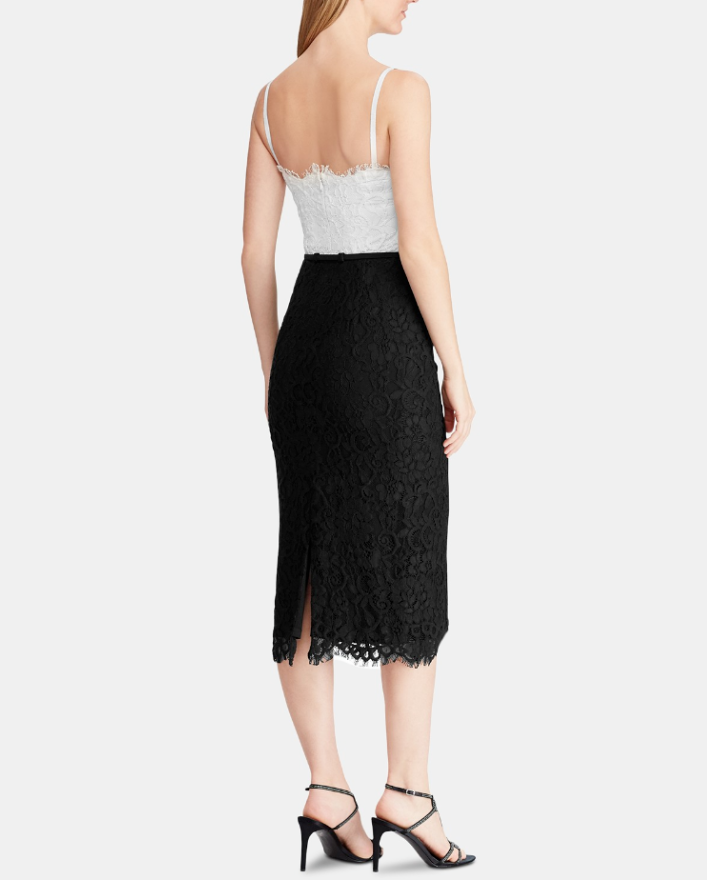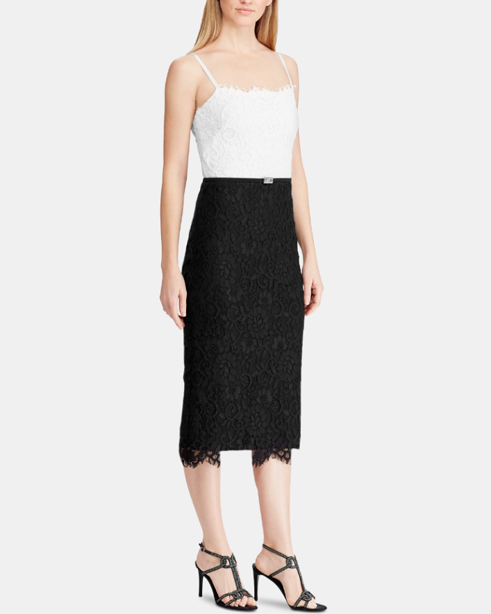 A modern color blocked design is elevated by luxurious lace to create this sophisticated cocktail dress from Lauren Ralph Lauren. Delicate spaghetti straps and a rhinestone buckle at the waist complete the look.