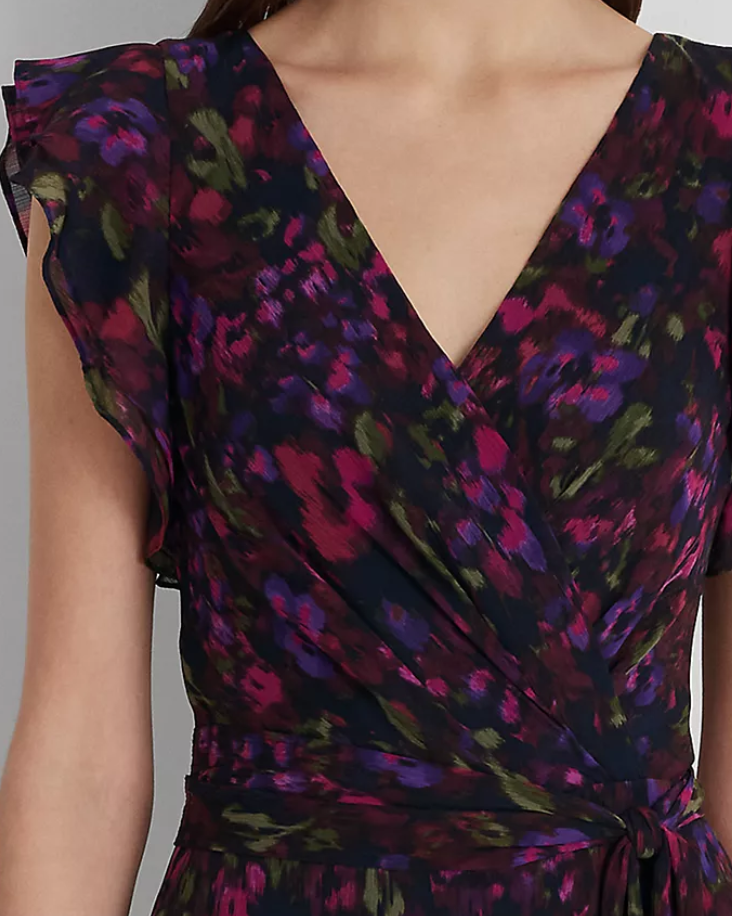 Showcasing the season's vibrant floral motif, Lauren Ralph Lauren's floor-sweeping gown pairs crinkle georgette with cascading ruffles to create effortless movement. Flutter sleeves amplify its graceful appeal, while a self-belt defines the waist.
