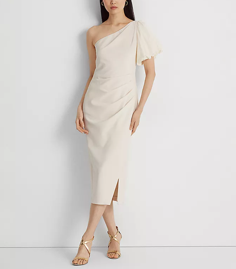 Perfect for a special occasion, this stunning cocktail dress from Lauren Ralph Lauren is cut from body-hugging crepe with delicate pleats and is distinguished by a sexy one-shoulder silhouette. A voluminous puffed taffeta sleeve and a side-seam slit elevate its romantic allure.