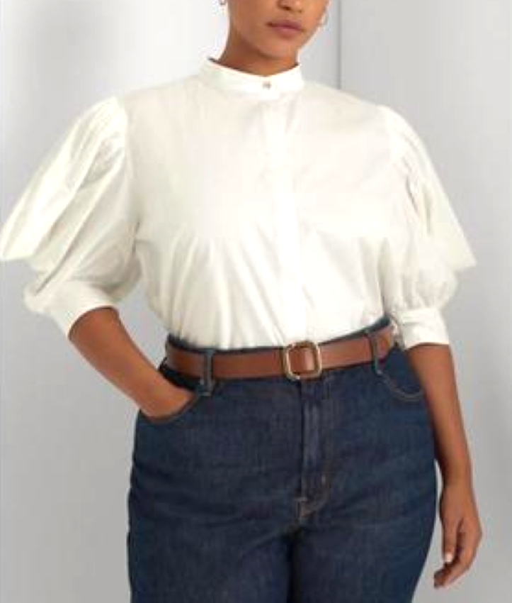 A feminine take on a timeless style, this sophisticated plus-size band collar shirt showcases dramatic puffed sleeves and "LRL"-engraved buttons at the collar and cuffs.