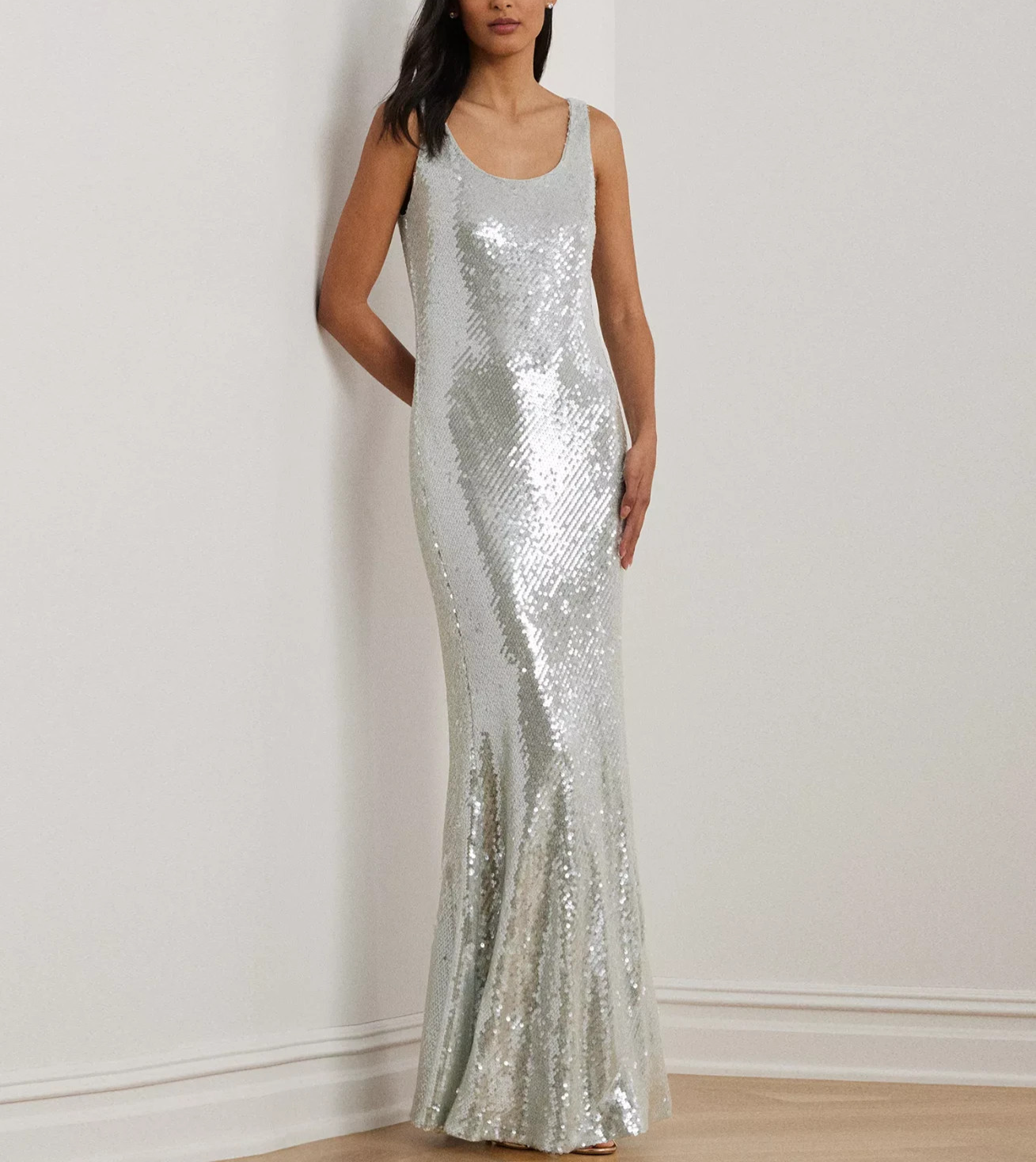 A captivating addition to your eveningwear collection, this sleeveless Lauren Ralph Lauren gown features a floor-length column silhouette constructed with sequined tulle for a luminous finish.