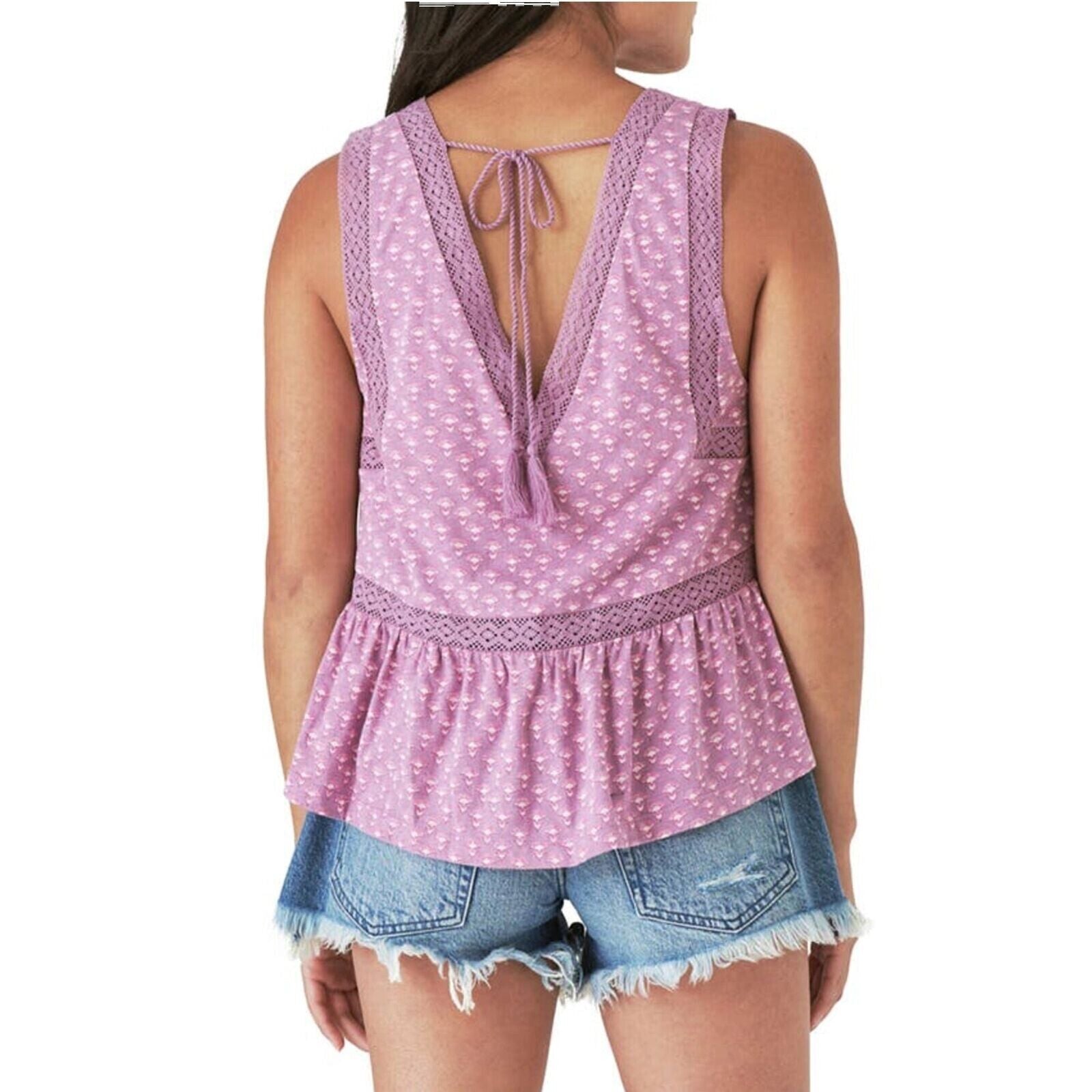 Relaxed fit V-neck Sleeveless Lace details Tassel ties in back Printed 100% cotton Machine wash cold Imported