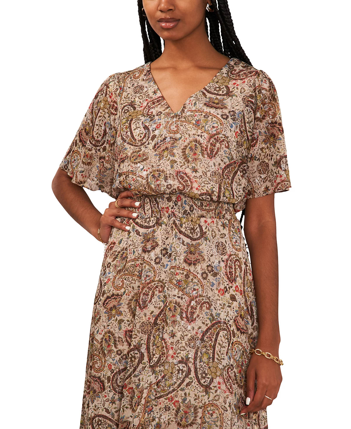 A smocked waist elegantly defines this flutter-sleeve maxi dress from MSK.