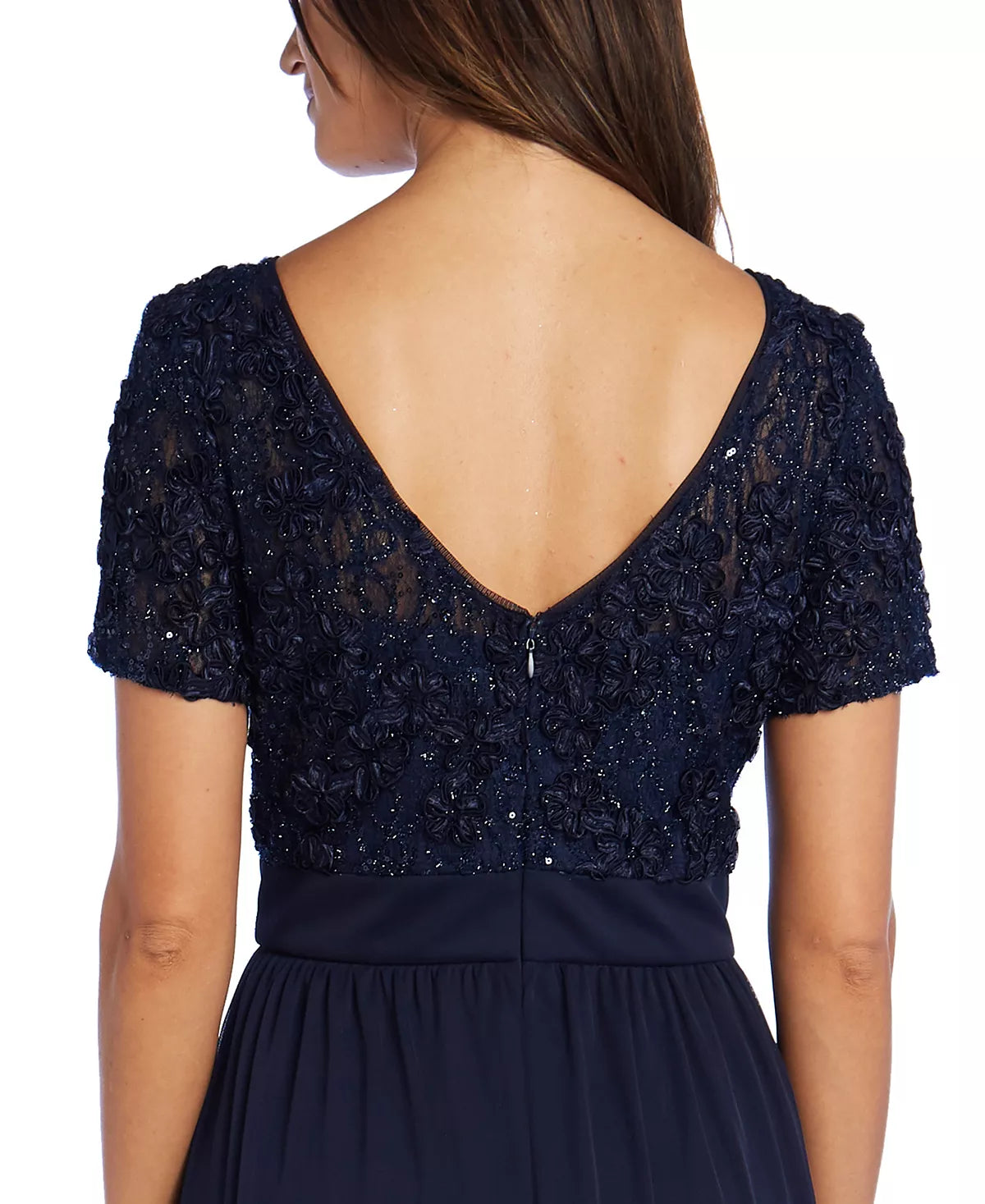 It's a formal affair. Get prepped the princess way with this super-detailed gown from R & M Richards, it's covered in sequins and ruffles for the full effect.