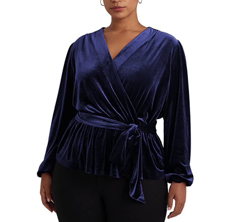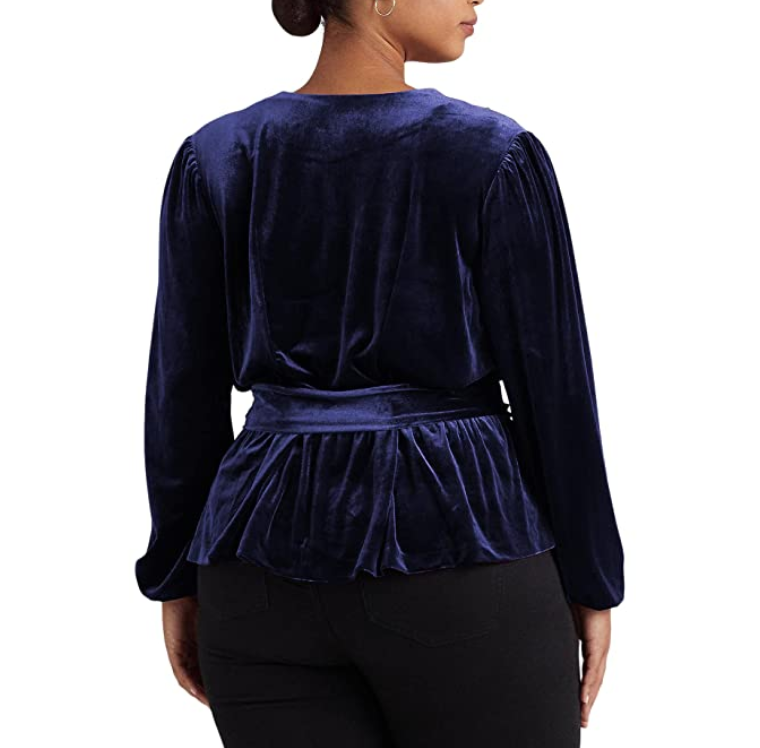 With a waist-defining belt and an elegant surplice silhouette the Plus Size Belted Velvet Peplum Surplice Top by LAUREN Ralph Lauren is rendered in velvet with just a hint of stretch for a lavish look and comfortable feel.