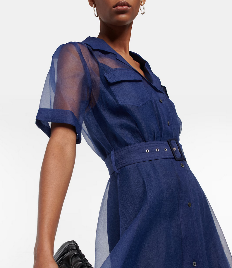 Shirtdress style steps away from desk duty with a sheer overlay and a dreamy full skirt.