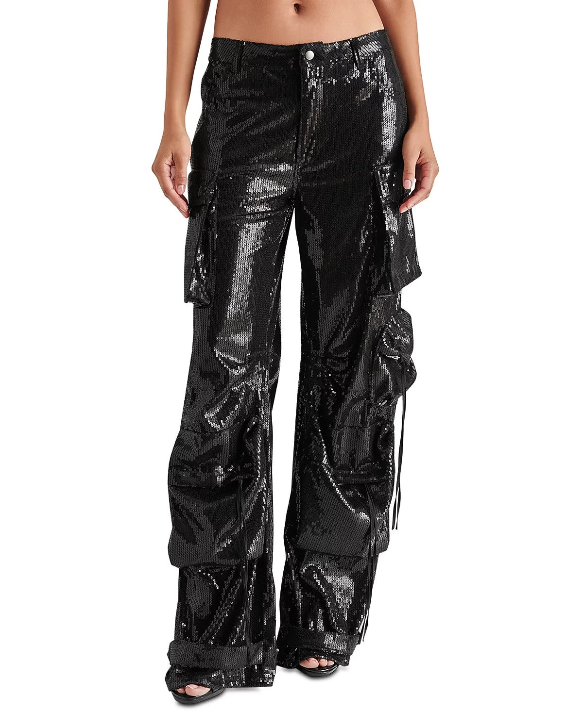 Front zipper with snap closure Belt loops Two on-seam pockets at hips, two back patch pockets, two side leg cargo pockets Baggy silhouette Allover sequin design 32" inseam 100% Polyester Hand wash Imported