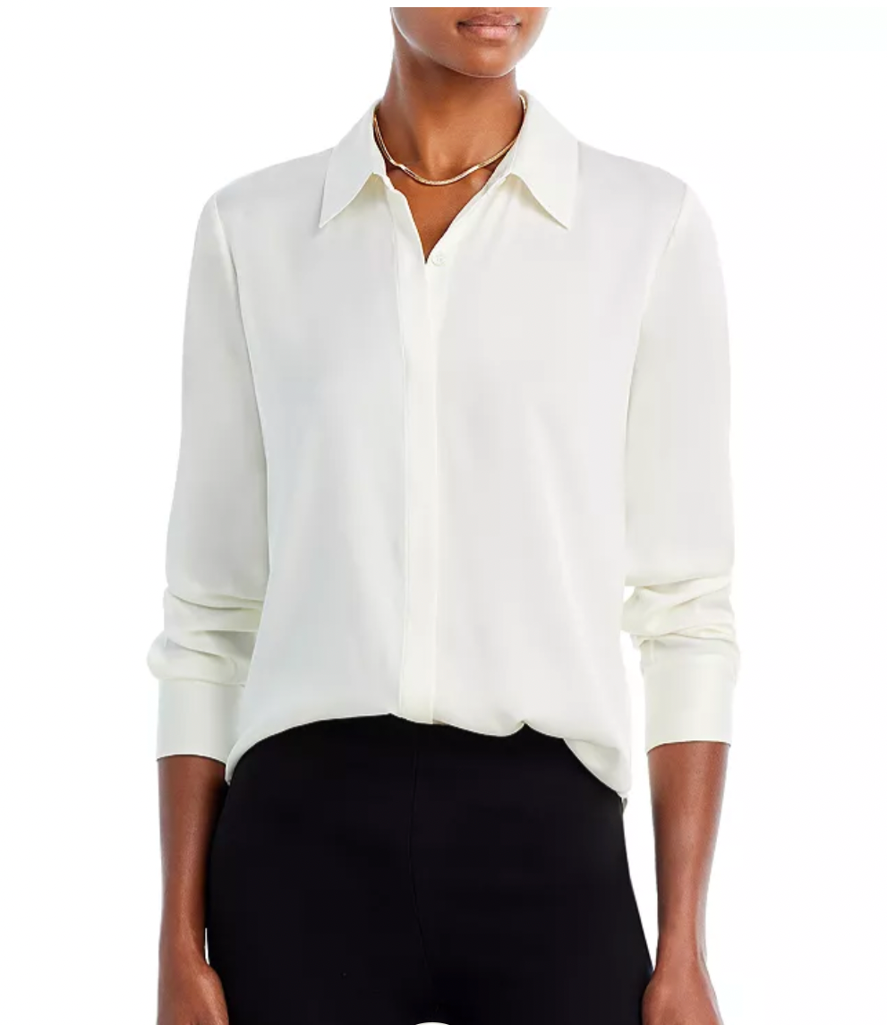 Point collar Long sleeves, button cuffs Concealed button front placket Back box pleat High/low rounded hem, straight silhouette Silk/spandex Dry clean Imported