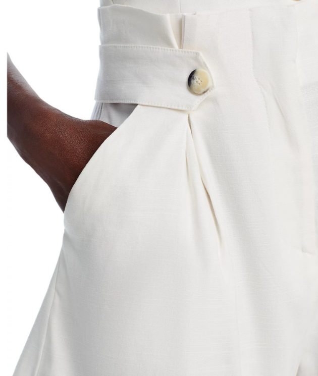 Front zip fly Button tabs at waistband Two on-seam pockets at hips, two back welt pockets Front pleats A-line silhouette High rise 3" inseam Linen/viscose/elastane; lining: polyester Dry clean Imported