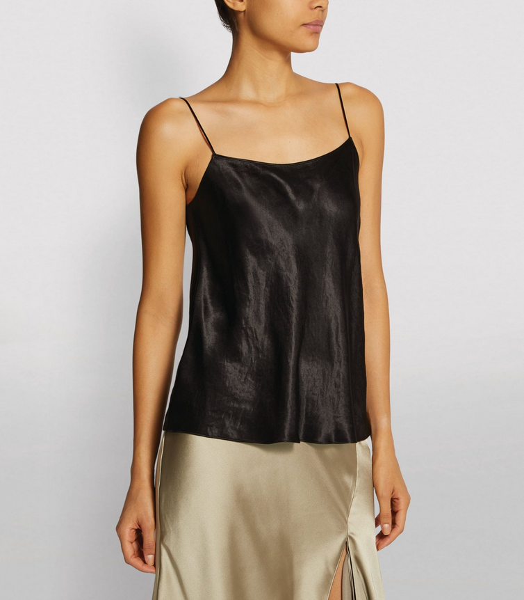 Crafted from a fluid silk-like material for an elegant drape, this cami top by Vince is a summertime staple. A piece that lends itself to any ensemble, it features adjustable thin straps and a loose fit that creates a casual aesthetic. Pair it with a leather skirt and heels for contemporary evening style.