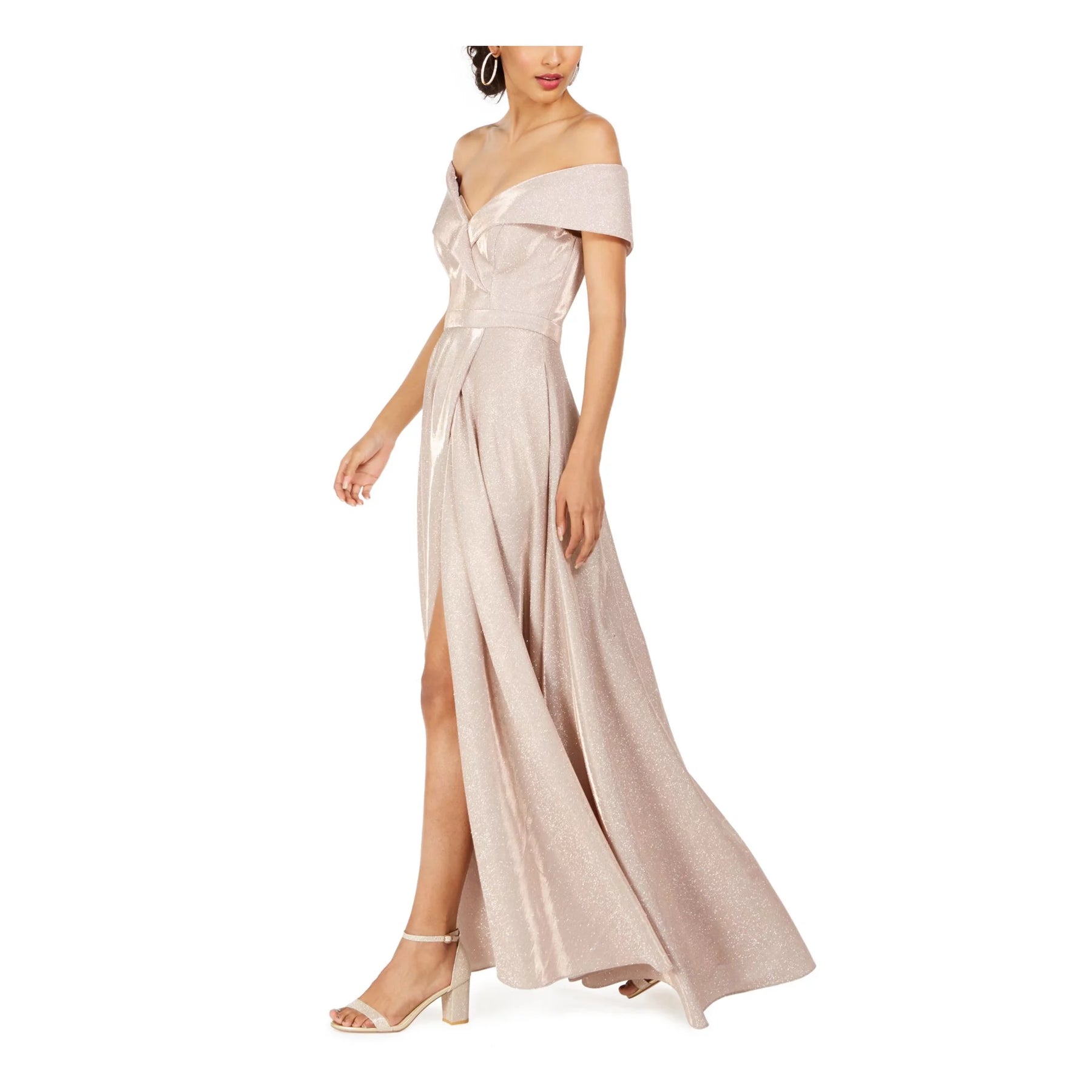 Shimmer into the room in the lavish sparkle of this petite glitter gown, styled with a beautiful off-the-shoulder neckline, from XSCAPE.