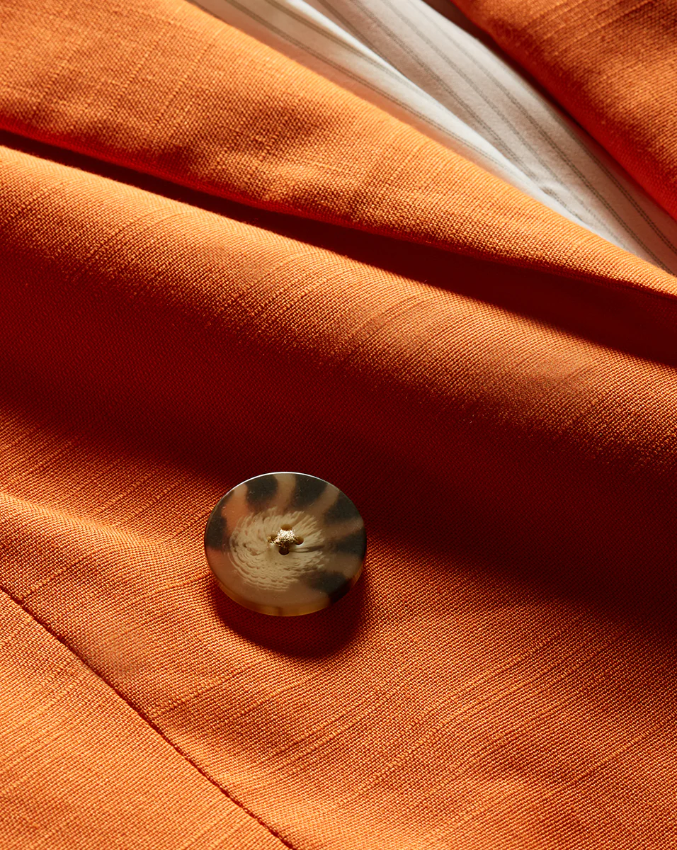 Expertly tailored in premium stretch-linen from France, the Bexley is the ultimate in effortless chic. With an elongated, fluid silhouette and thoughtful construction, this double-breasted style creates a perfect drape on the body. Padded shoulders, peak labels, tortoiseshell buttons and flap pockets complete the look. Embrace the vibrant orange hue and pair with the matching Franzi short for a summer power suit moment.