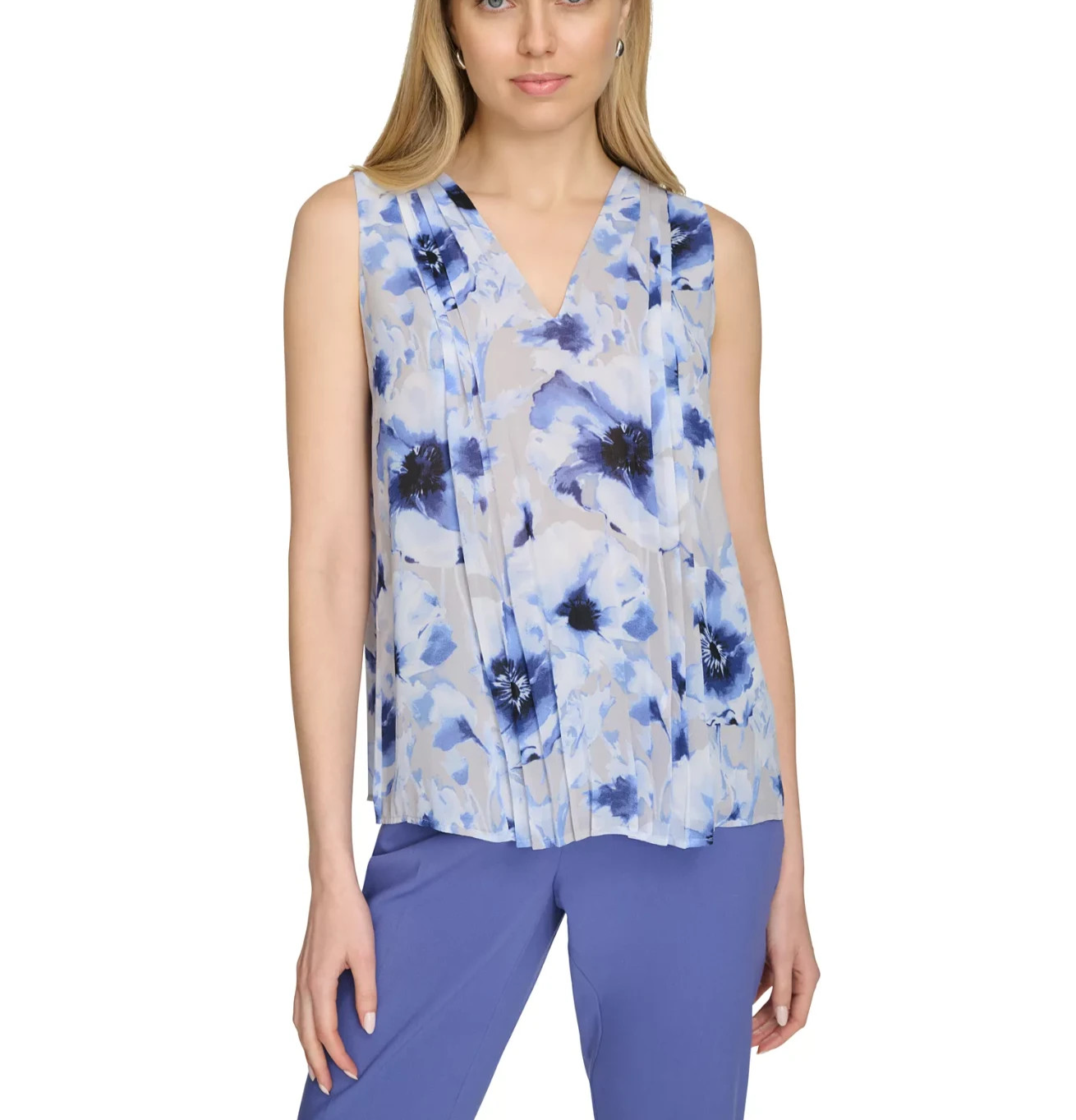 Calvin Klein Women's Printed Sleeveless Pleated Top MSRP $69