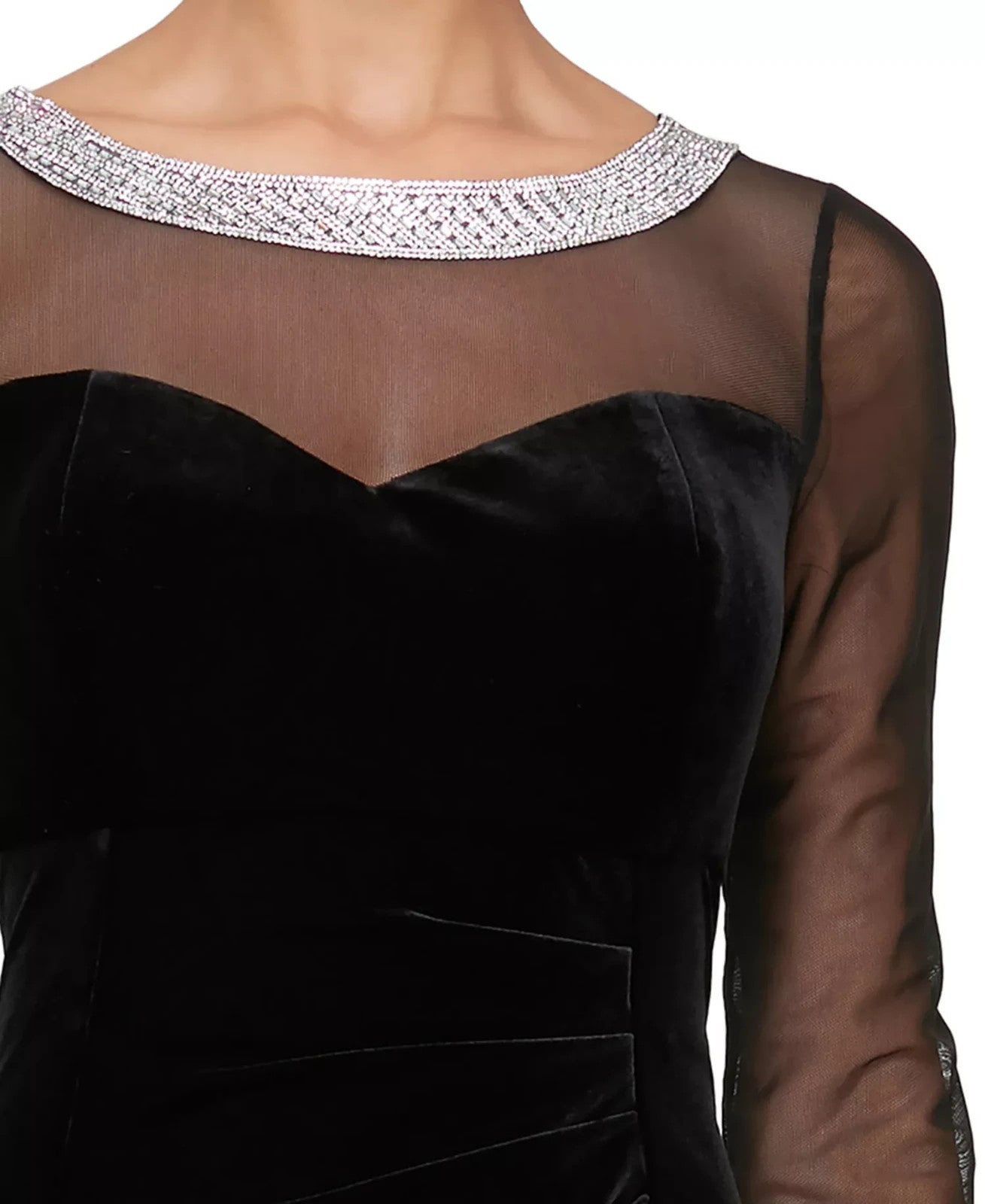 A stunning mix of velvet, illusion mesh, and glittery embellishments, this Alex Evenings gown will have you feeling like a superstar all night long.