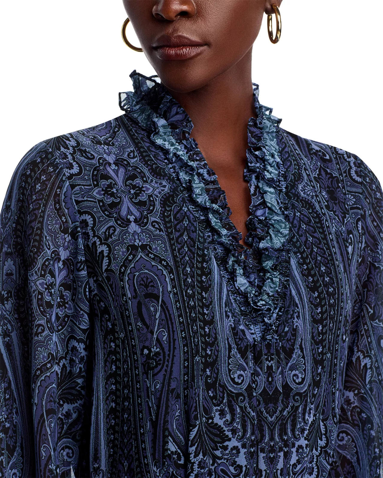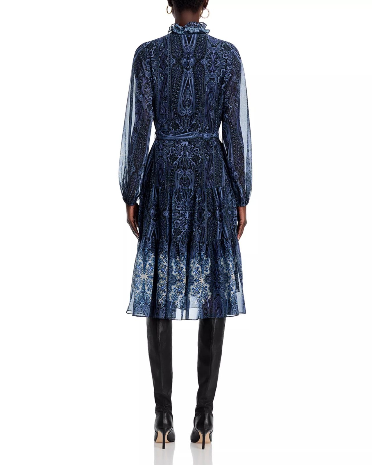 Features V-neck, ruffled trim Sheer blouson long sleeves Tie belt at waist Tiered skirt Border print at hemline Imported Designed to hit below the knee